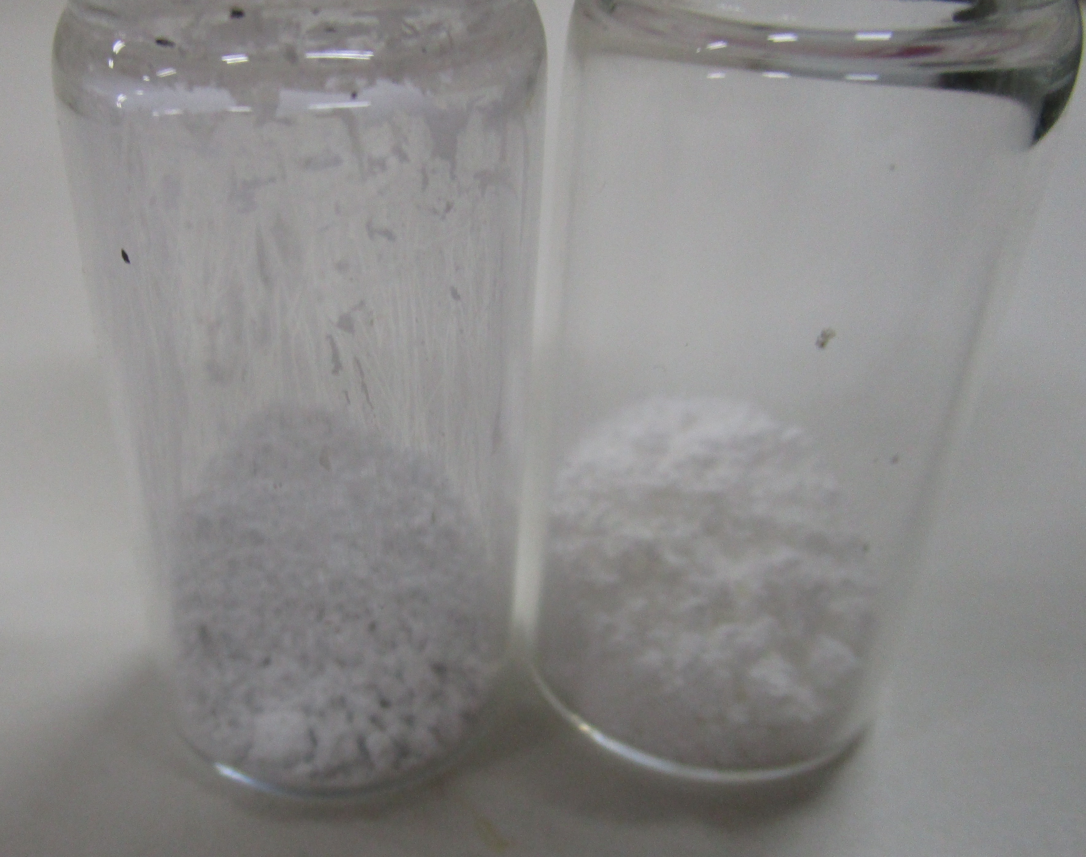 高繰返しパルスレーザー照射直後 粉末 左:レーザー照射後 中央:酸化チタン粒子
