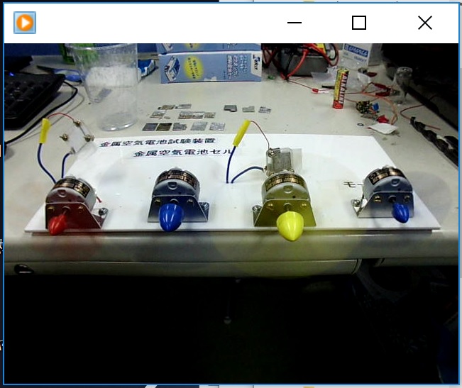 空気電池の実験 左:Mg空気電池、右:起電力が改善された空気電池