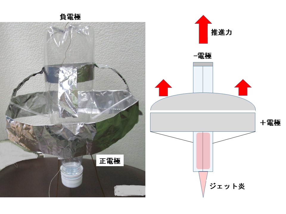 ペットボトルの下側から点火を行うと内部でガスの燃焼波が上方向に進行し、その際、直流高電圧が炎により増幅され一桁上の高電圧が発生した。EHD推進力の増大を今回の実験で確認することに成功した。実験ではEHD推進実験装置は上記動画のように垂直上方向に急上昇した。