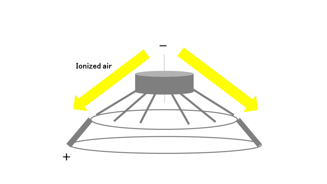 EHDと静電気力を利用した大気中推進システムにおいて、発生する推進力を従来の方式と比べて改善させることに成功した。今回、負極から発生したイオンを効率よく閉じ込める円形電極構造を採用し、また、空間電荷と電極(通常の電極のみでなく分極効果により分極を生じた電極)との相互作用により発生する静電気力を利用した。金属の分極効果を利用することで推進力を大幅に改善することに成功した。これは、別の言い方を用いると同電力に対して推進力を増幅するシステムを考案したことを意味する。