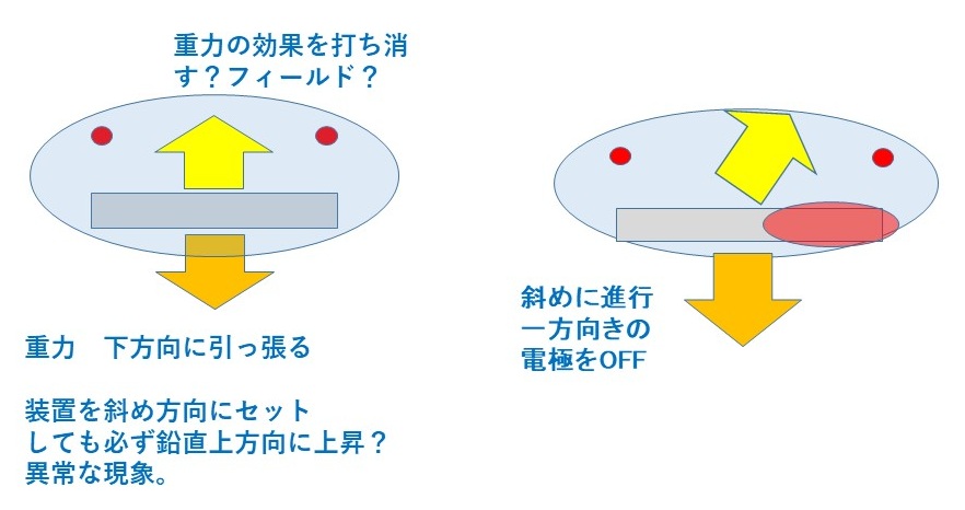 このデバイスは原理的に重力に反発するように浮上する挙動を示すため、これを利用して斜め方向に推進させることを考える。