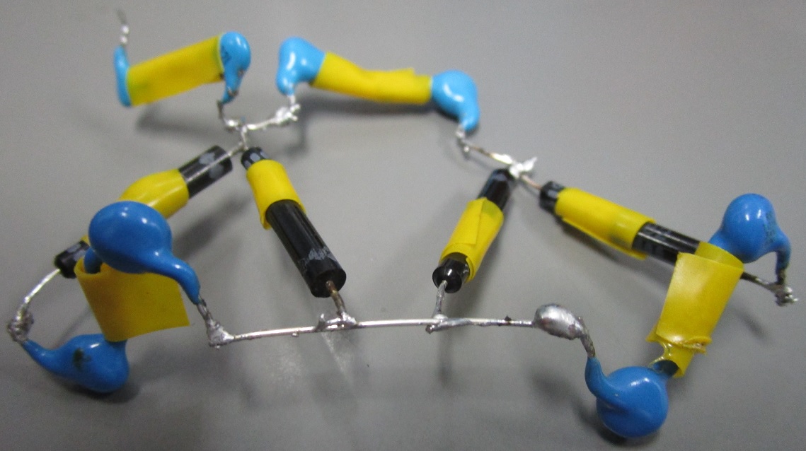 ということで、超軽量コンデンサの開発を行いました。コンデンサが蜜に直列接続された形になっています。