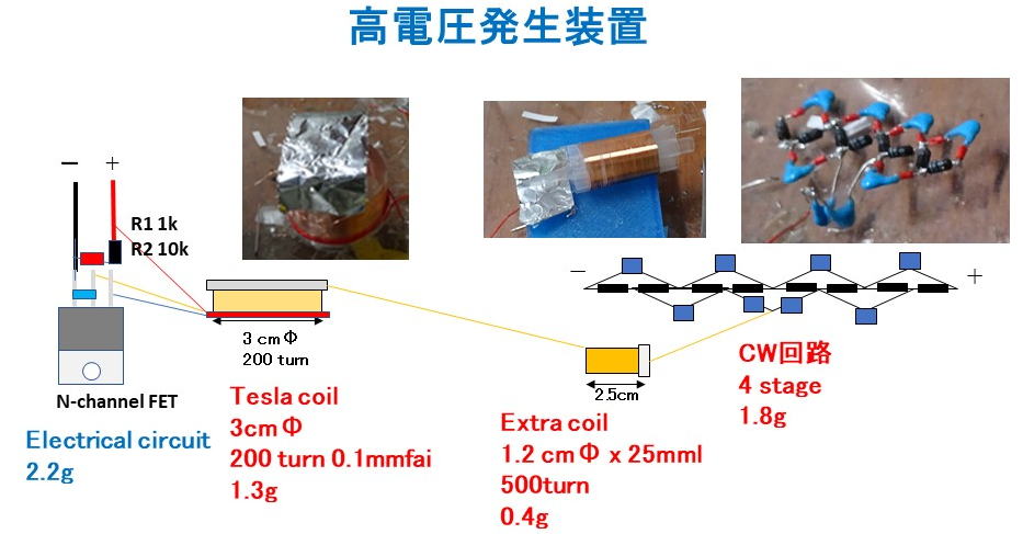 EHD推進デバイスの軽量化を図るため、直流高電圧装置CW回路とTCの極小型化を進めています。