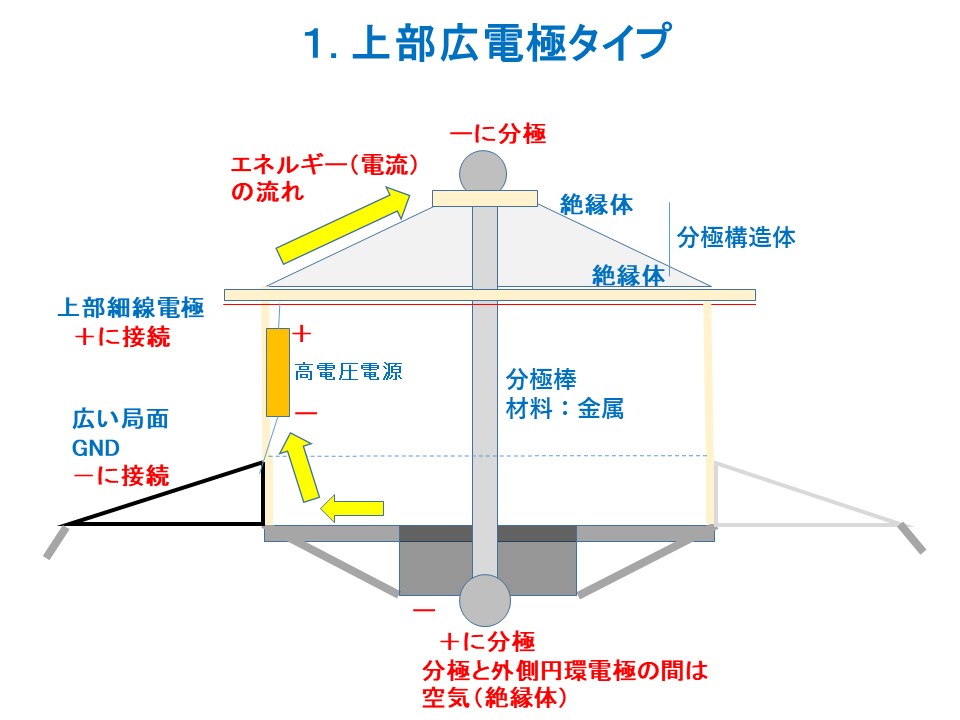 図1の方は、細い電極線の直径が大きい場合である。 上部に屋根となる円形の分極構造、中央部に分極電極が配置されている。